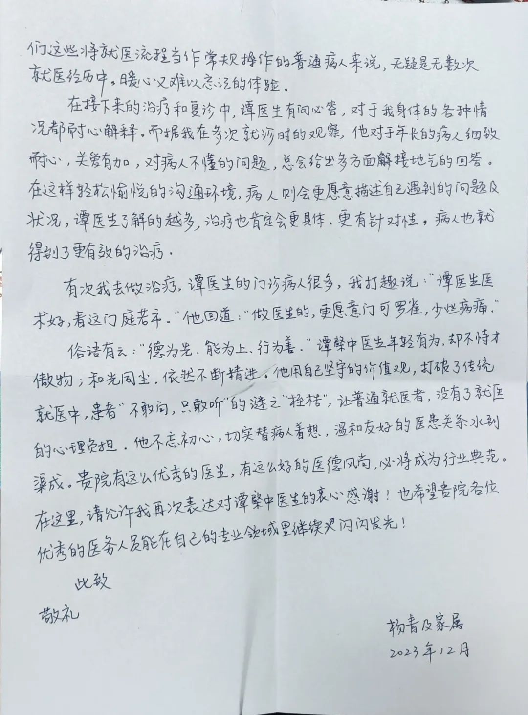 譚醫(yī)生表示,楊女士的認可和贊揚是他的榮幸,更是對他今后工作的鞭策。他說:“為患者提供最好的醫(yī)療服務是我作為醫(yī)生的職責。我很高興能收到楊女士的表揚,但我認為這更是一種鼓勵和肯定,我會更加努力工作,不辜負患者的期望?!?/p>