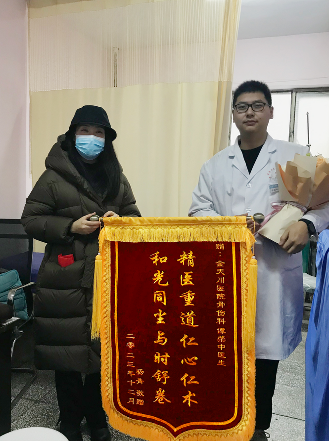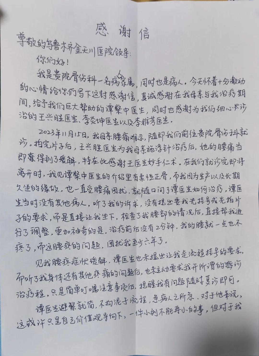 2023年12月28日,一位患者將一面寫有“精醫(yī)重道仁心仁術,和光同塵與時舒卷”的錦旗和一封表揚信送到烏魯木齊金天川醫(yī)院,以此表達對金天川醫(yī)院骨傷科譚棨中醫(yī)生及王興盛醫(yī)生、李炎坤醫(yī)生、李雅芳醫(yī)生精湛醫(yī)術和貼心服務的感激之情。這面錦旗不僅是對骨傷科醫(yī)生們的個人褒獎,更是對烏魯木齊金天川醫(yī)院對患者的優(yōu)質服務和診療質量的肯定。
