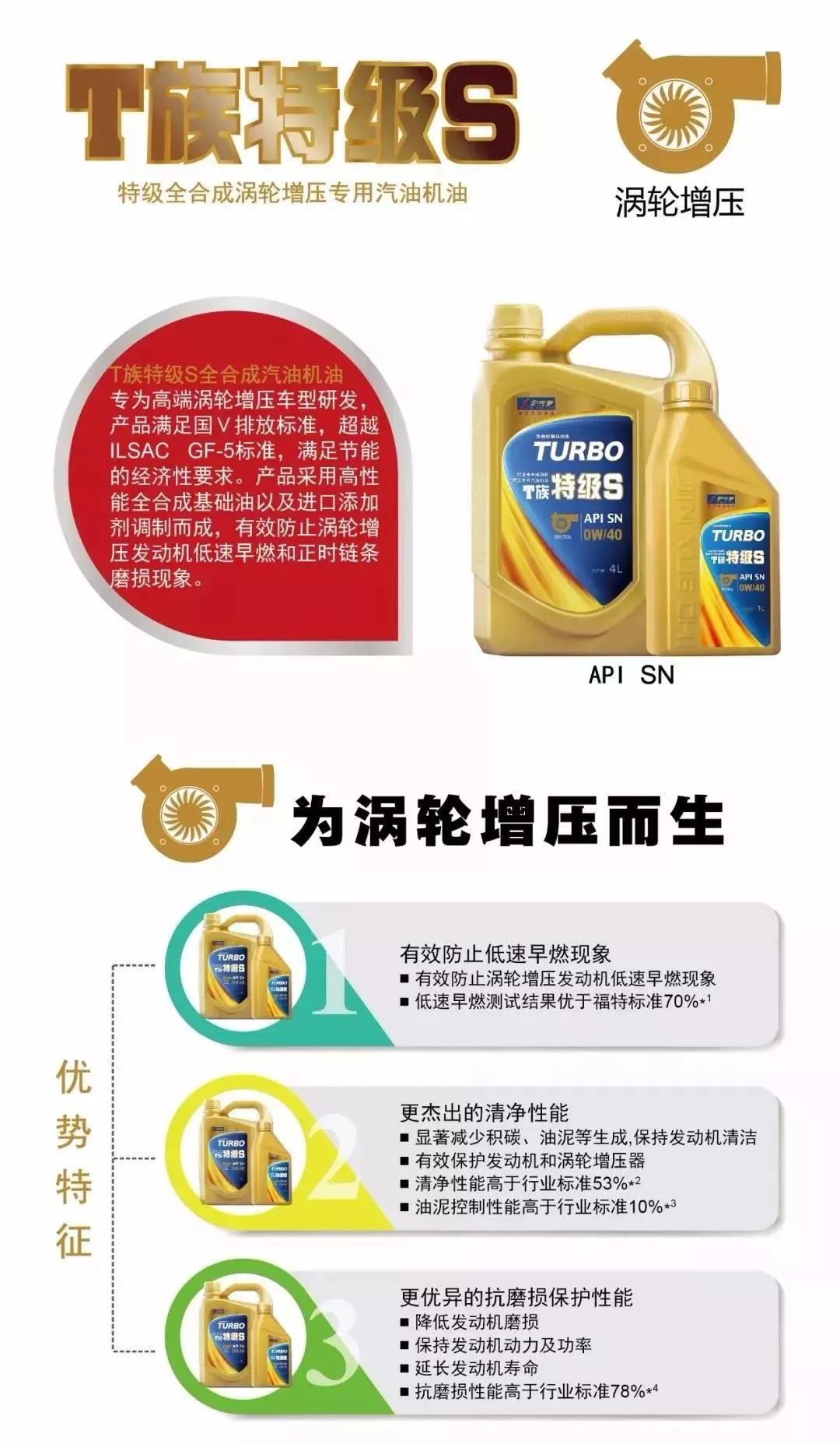 T族特級(jí)S全合成汽油機(jī)油作為國(guó)內(nèi)首款高端渦輪增壓發(fā)動(dòng)機(jī)專用汽油機(jī)油,在產(chǎn)品設(shè)計(jì)上極大地放大了渦輪增壓發(fā)動(dòng)機(jī)的動(dòng)力優(yōu)勢(shì),彌補(bǔ)了低速早燃和正時(shí)鏈條磨損等方面的不足,在抗高溫、抗氧化、抗磨損等方面有著超強(qiáng)的優(yōu)越性,滿足了更多高性能車主及駕駛愛(ài)好者的差異化需求。