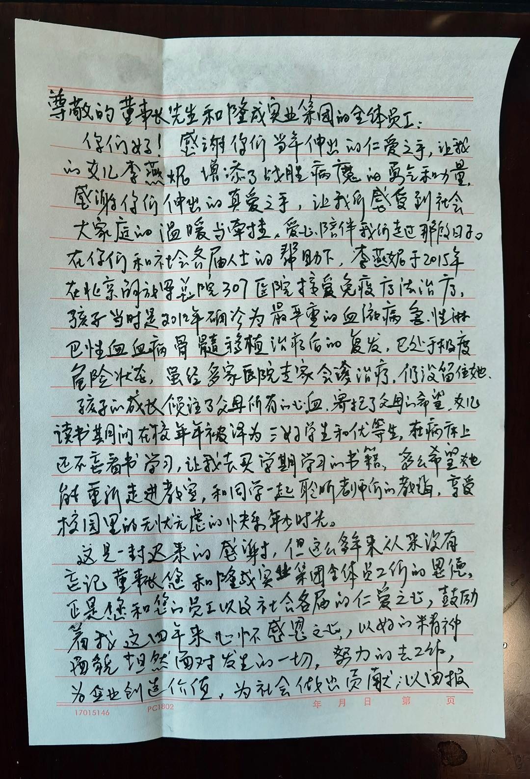 事由:金雪馳愛心基金于2012年援助了李先生,李先生女兒在2012年被確診為白血病,曾接受骨髓移植后又復(fù)發(fā),2015年在北京解放軍總院接受治療時已處于極度危險狀態(tài),隨后經(jīng)過多家醫(yī)院的專家會診治療,最終還是沒能將孩子的生命挽救回來,當(dāng)年在求醫(yī)路上接受到“金雪馳愛心基金”的捐助,一直對董事長劉輝先生和隆成實業(yè)的全體員工存有感恩之心,今日登門拜訪,并送上感謝信和答謝禮。董事長親切的接待了李先生也回贈于他金雪馳紀(jì)念品,董事長對李先生女兒的遭遇表示不幸,并表示了隆成集團對他的幫助是我們做企業(yè)人的社會責(zé)任,也希望“金雪馳愛心基金”今后能夠幫助到更多的人和事。